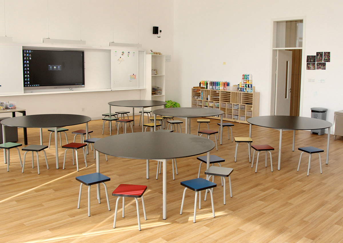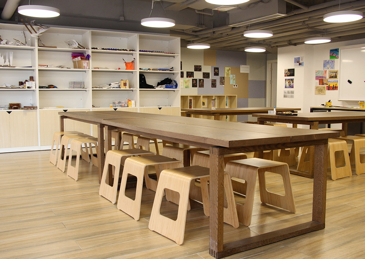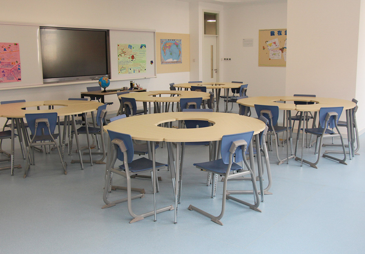 改變傳統的教室分隔和整齊排列的桌椅,重新設計成靈活的、隨意的“開(kāi)放式教學(xué)空間”。
